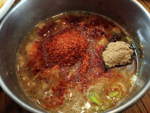 10分ほどしてつけ麺到着。普通のつけ麺に写真のように大量の唐辛子が入っています。