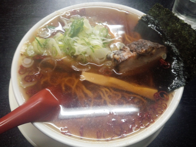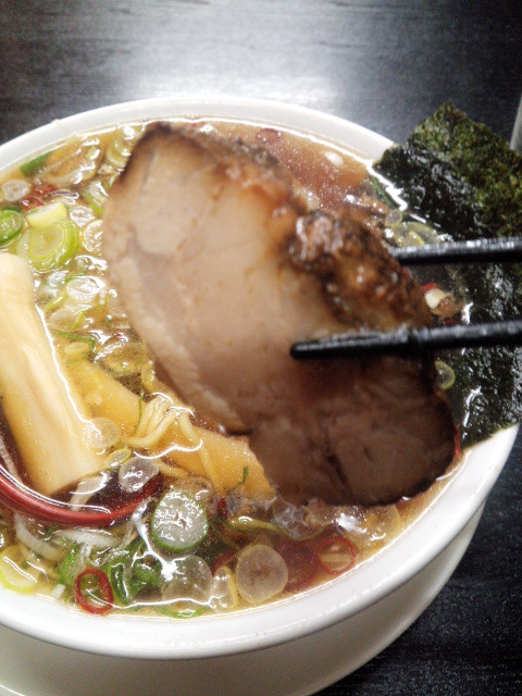 透き通ったスープはチャーシューの煮汁をお湯で割っているようで、これがちょうどいいあっさり加減。しばらくすると極厚のチャーシューから脂が染み出してきて味が変化していくのが楽しめます。「ピリ辛」はベースのスープに唐辛子の輪切りが加わり、辛味がプラスされています。