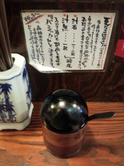かなり辛い部類に入る担々麺だと思いますが、卓上にはさらに辛さを加える調味料が、